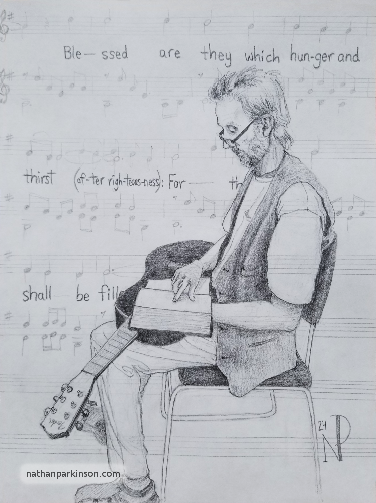 07/12/2024 • Art • Bible, characters, guitar, music, pencil, portrait, props