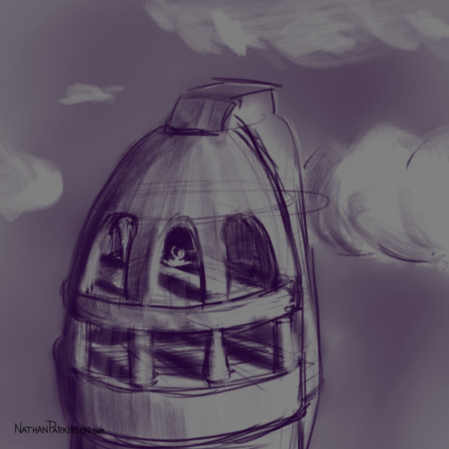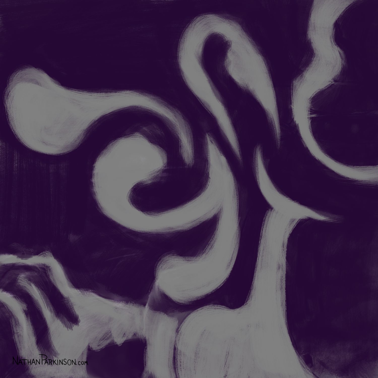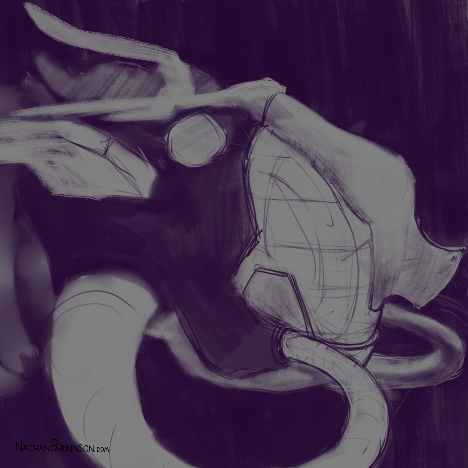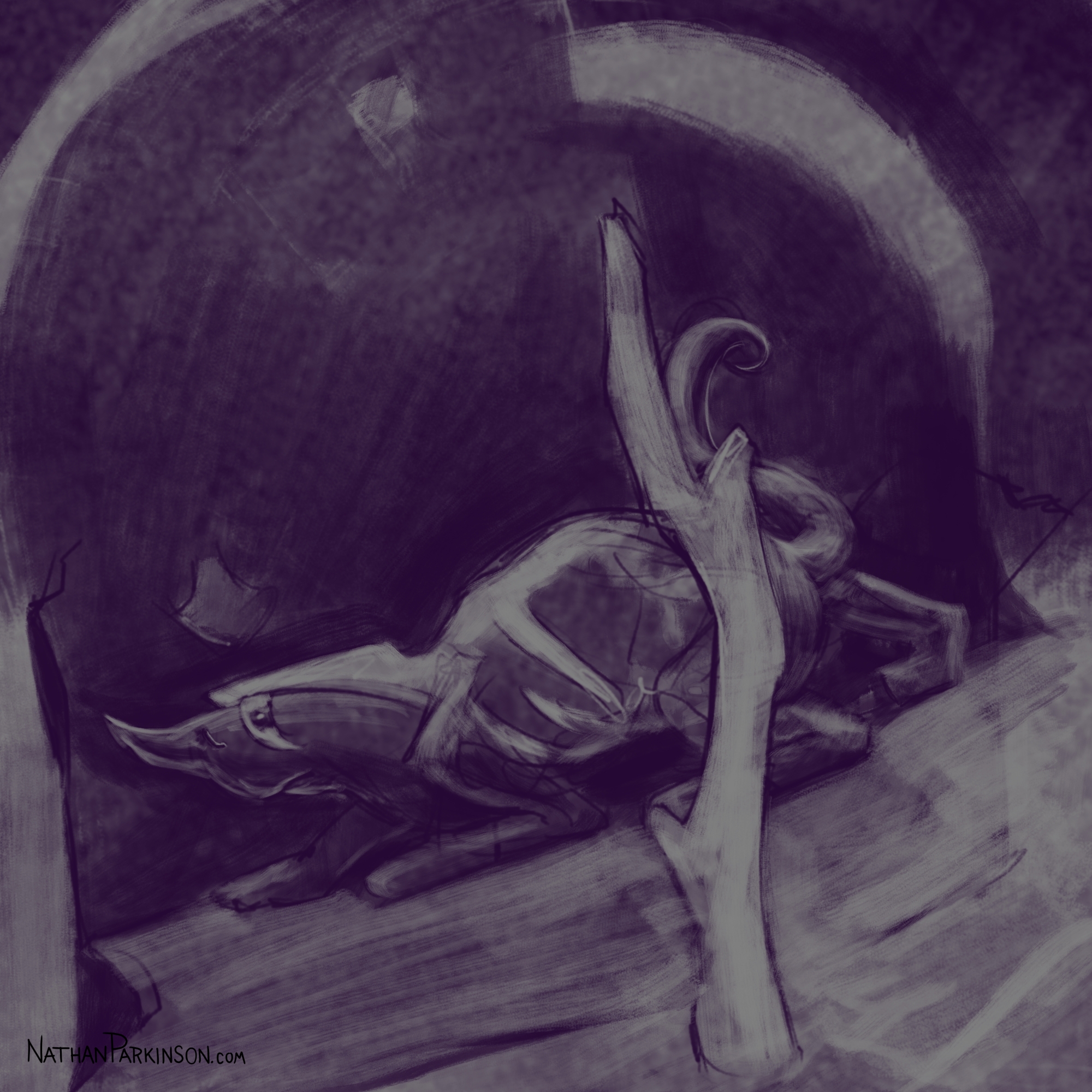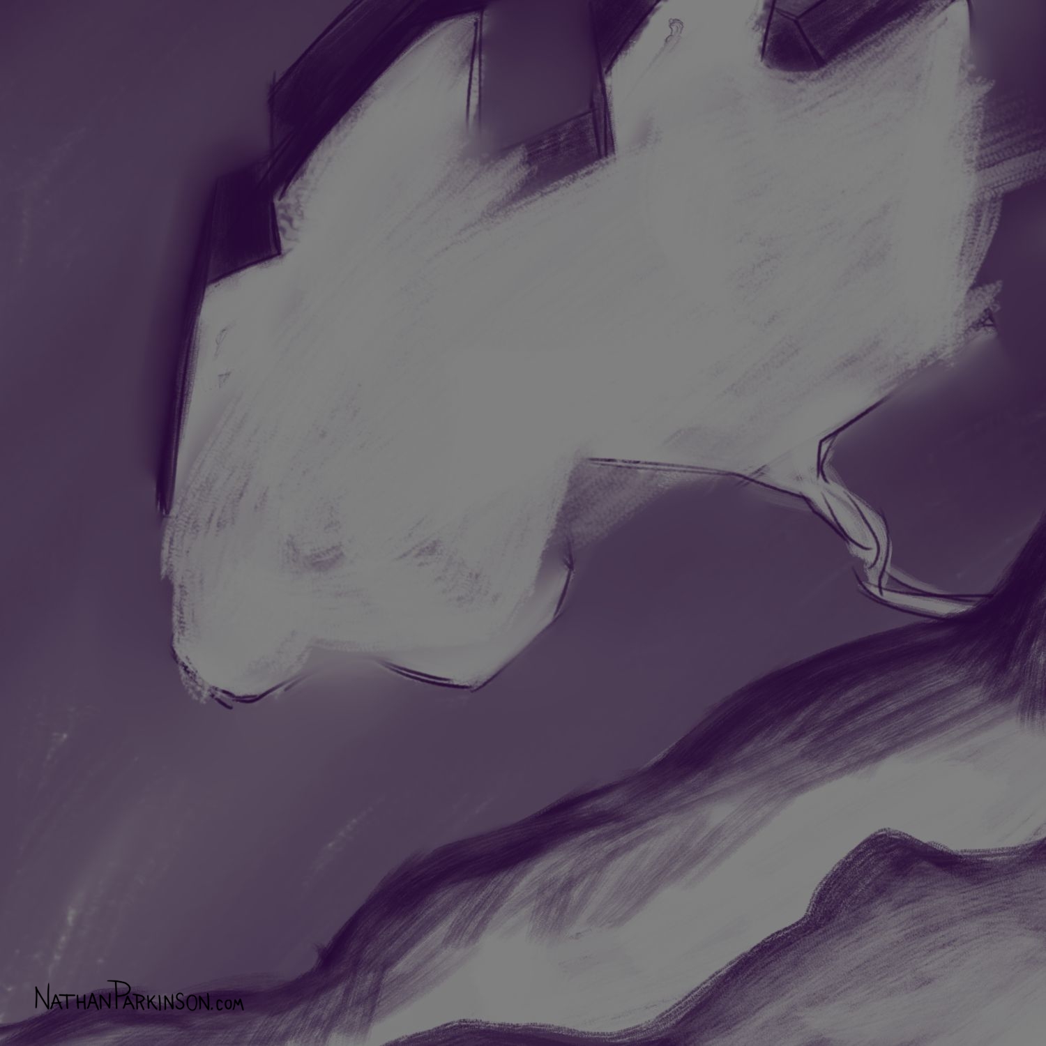 I created a square canvas with a single active layer on a gray background. I chose a pencil brush for drawing and a paint brush for painting and a single colour (I settled on dark purple). At the start of each day I spent about 30 minutes drawing on this single canvas from memory and imagination. I would take whatever was there from the day before and I would morph it into something else. I eventually began to use some white for highlights and light sources, but I only ever drew on one layer. I drew to get darker and erased to get lighter against that gray background. I came to really enjoy this process and I encourage you to try it. I got some really fun results. I think this is a great way to get back your love for drawing just for the fun of it (if you’ve lost it).