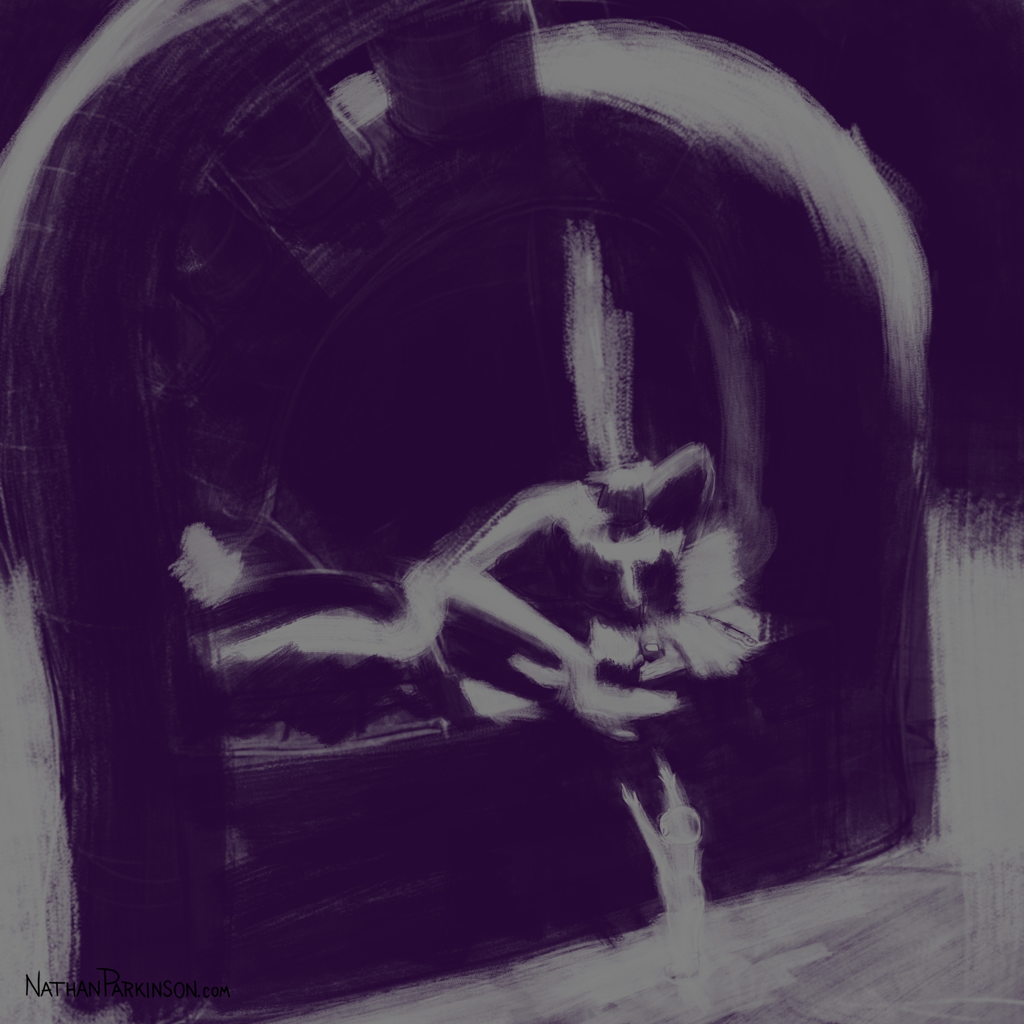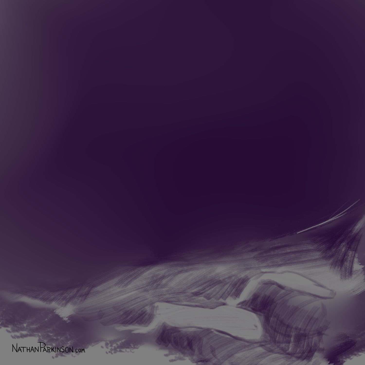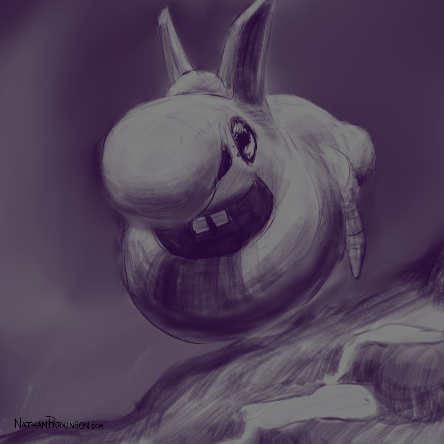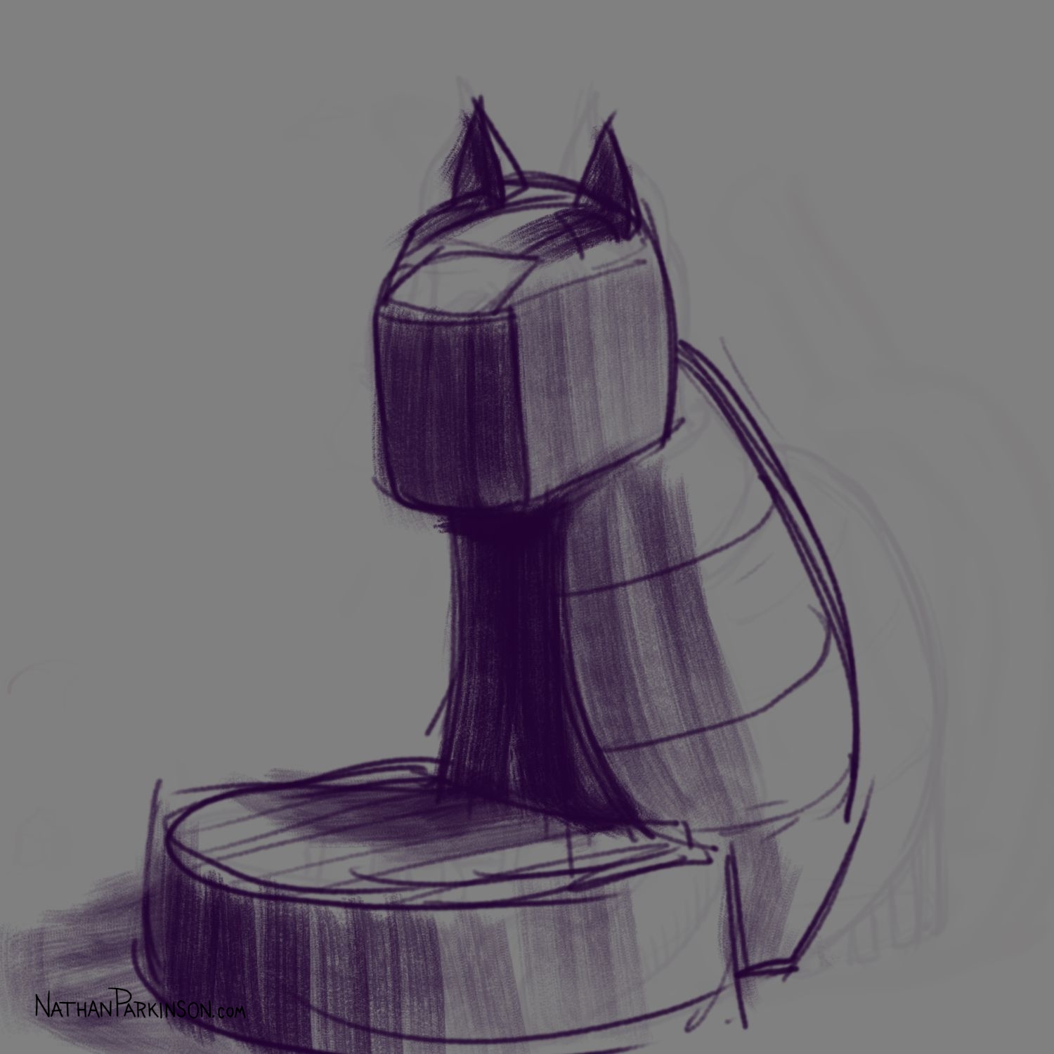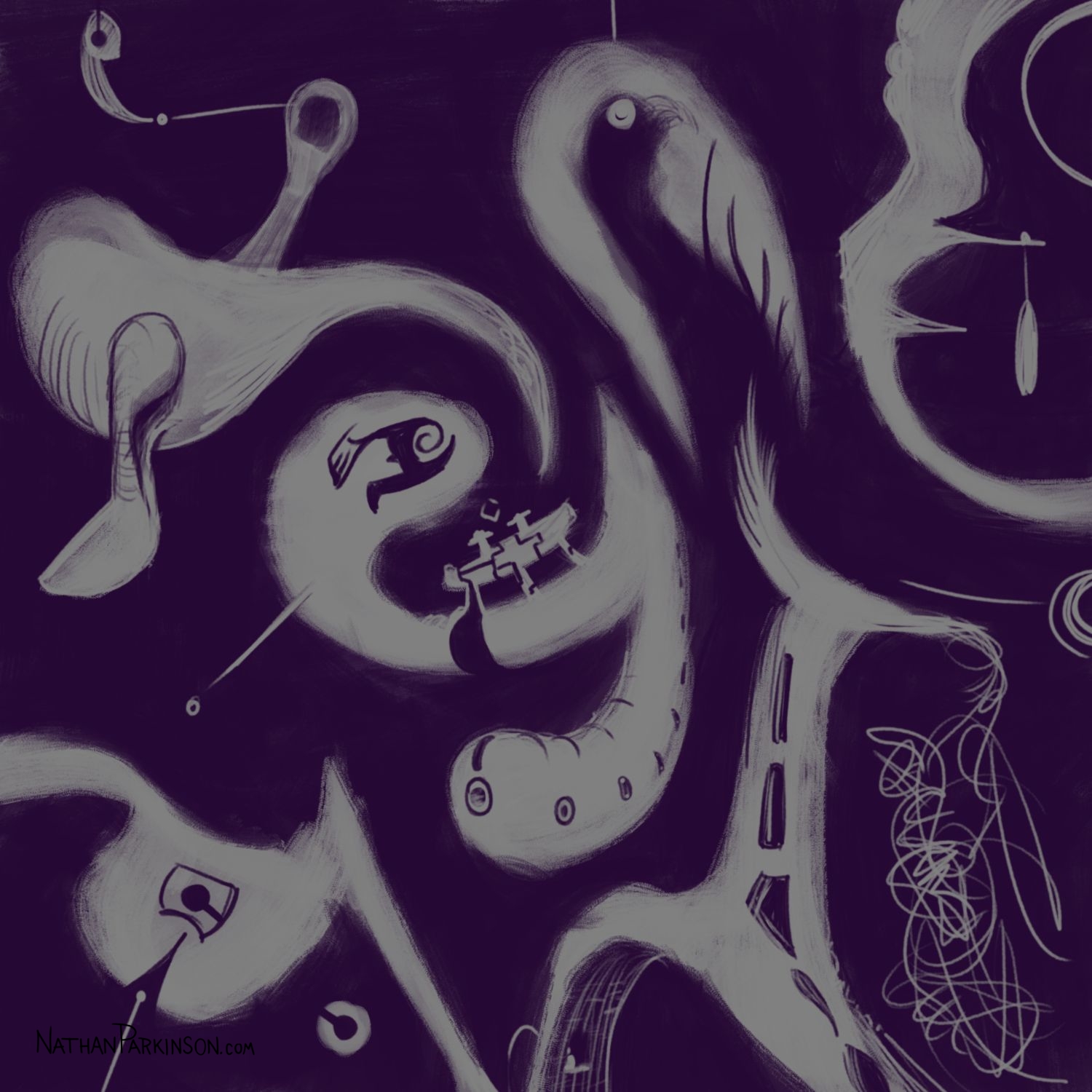 I created a square canvas with a single active layer on a gray background. I chose a pencil brush for drawing and a paint brush for painting and a single colour (I settled on dark purple). At the start of each day I spent about 30 minutes drawing on this single canvas from memory and imagination. I would take whatever was there from the day before and I would morph it into something else. I eventually began to use some white for highlights and light sources, but I only ever drew on one layer. I drew to get darker and erased to get lighter against that gray background. I came to really enjoy this process and I encourage you to try it. I got some really fun results. I think this is a great way to get back your love for drawing just for the fun of it (if you’ve lost it).