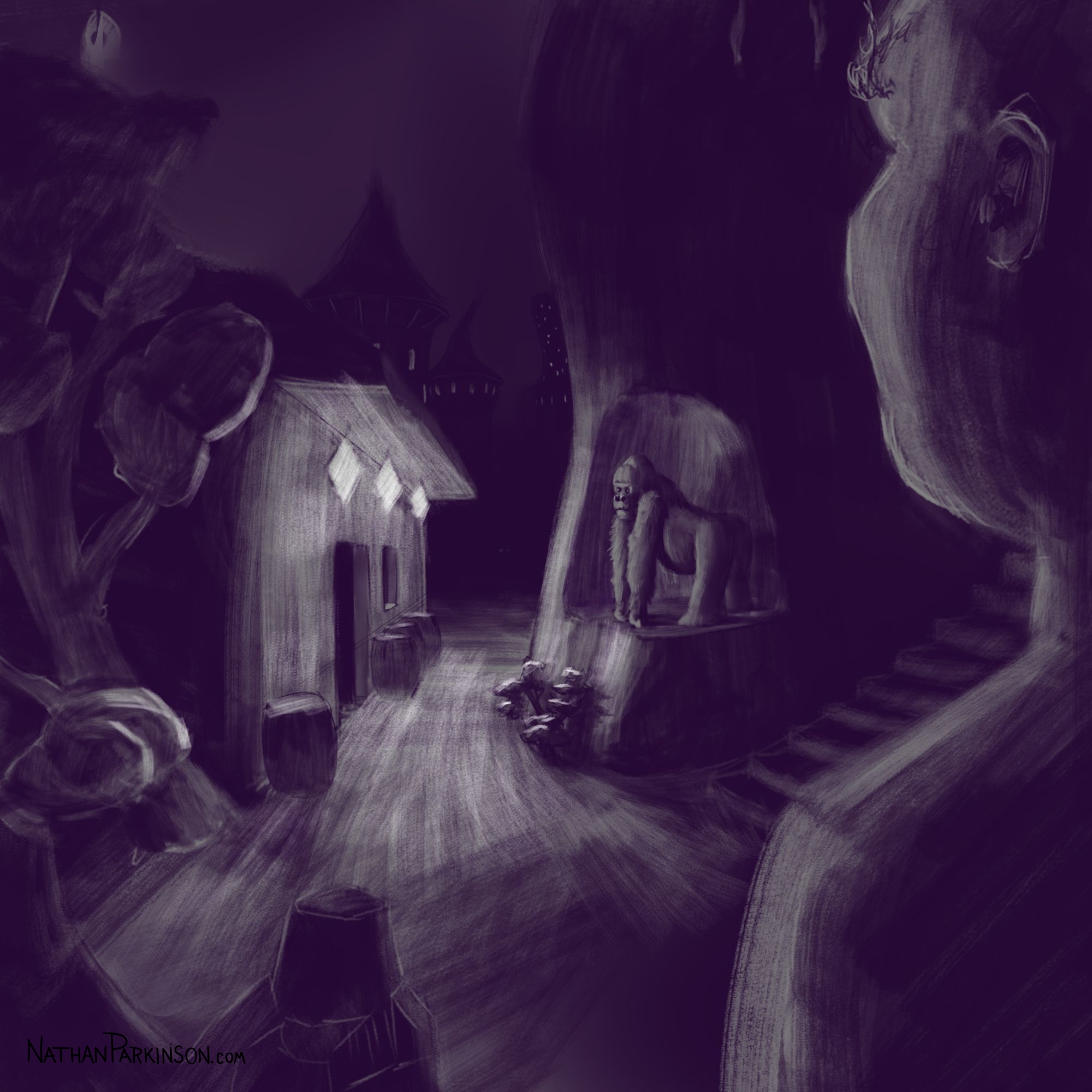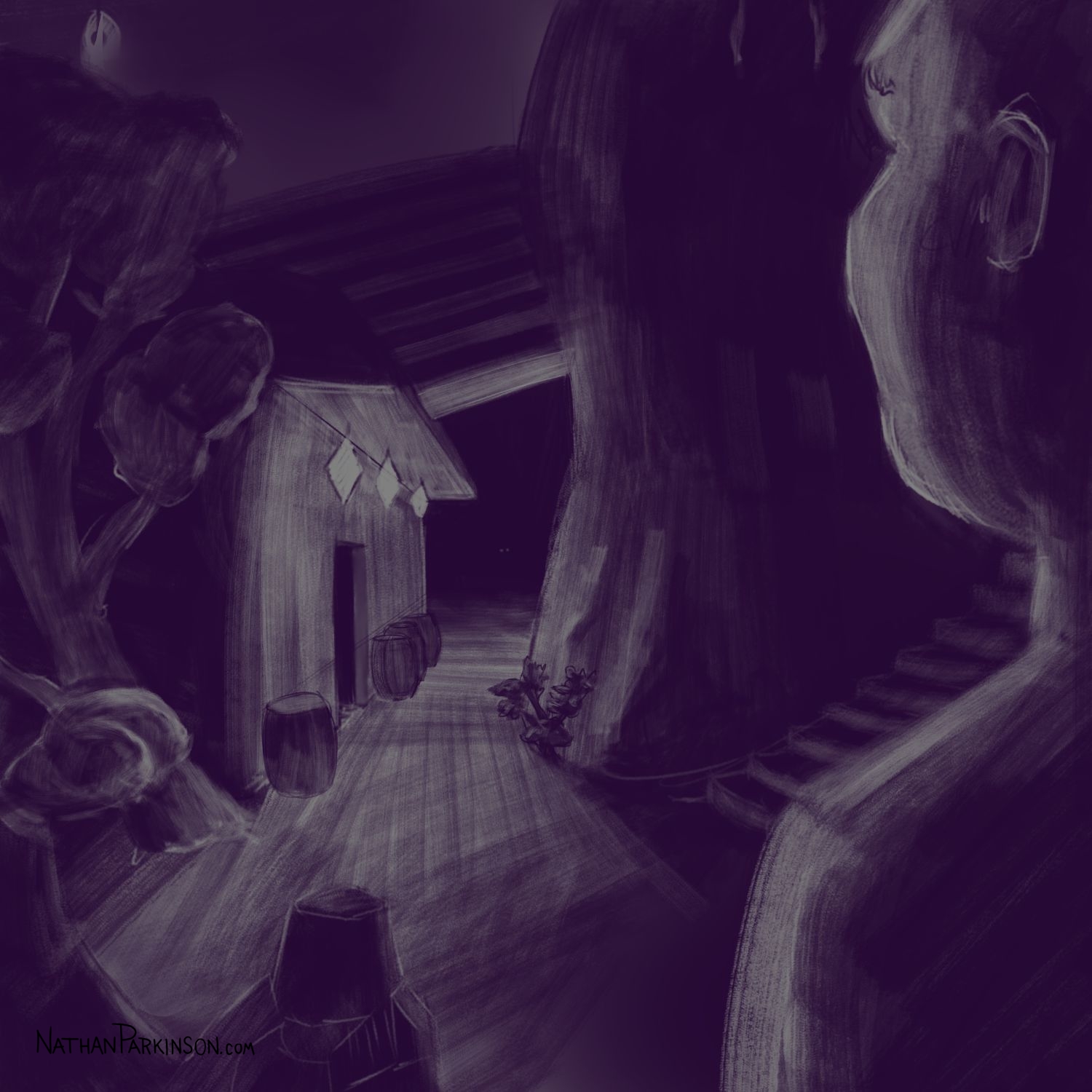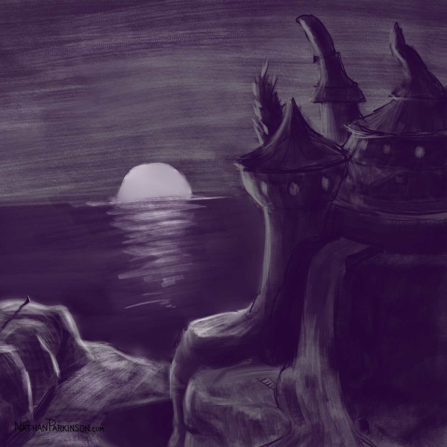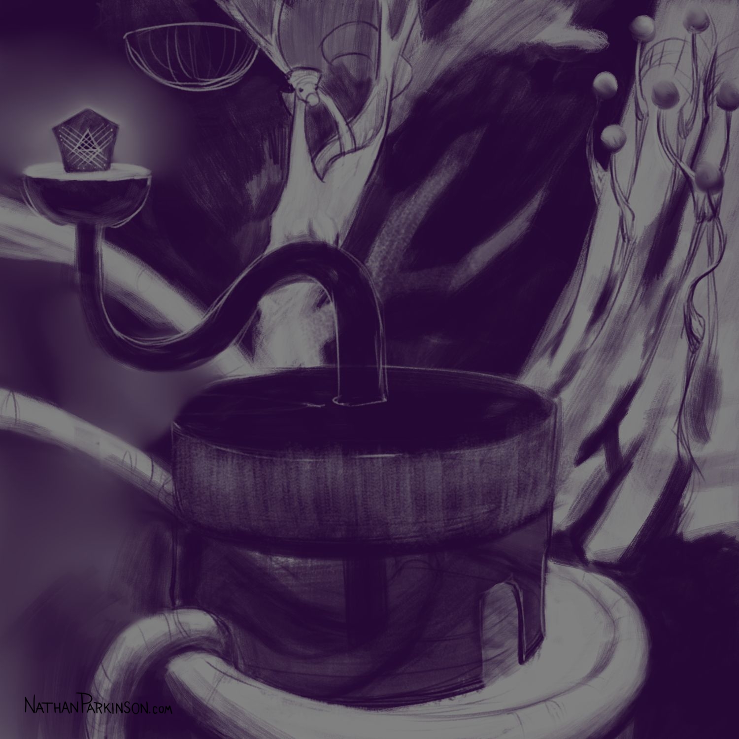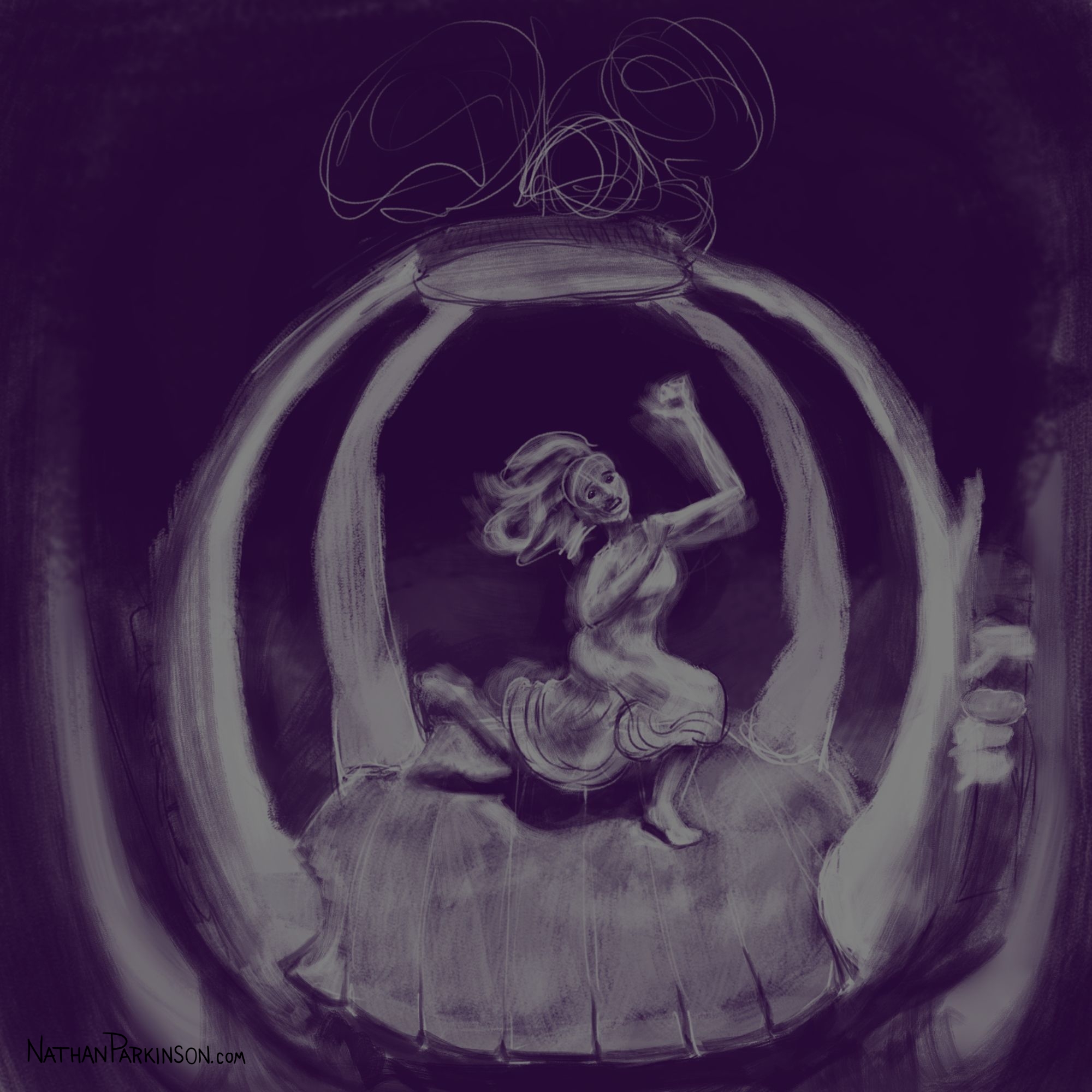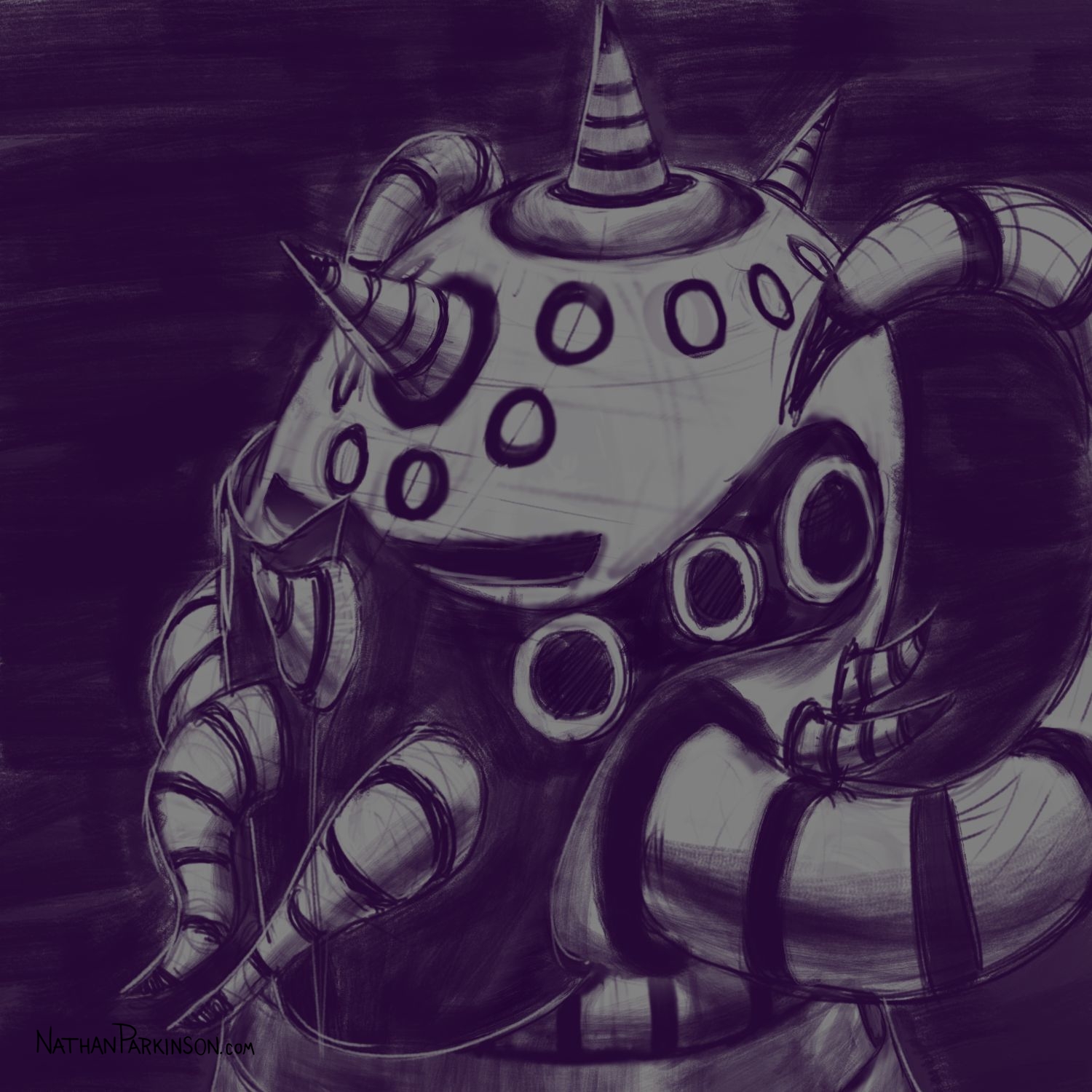 I created a square canvas with a single active layer on a gray background. I chose a pencil brush for drawing and a paint brush for painting and a single colour (I settled on dark purple). At the start of each day I spent about 30 minutes drawing on this single canvas from memory and imagination. I would take whatever was there from the day before and I would morph it into something else. I eventually began to use some white for highlights and light sources, but I only ever drew on one layer. I drew to get darker and erased to get lighter against that gray background. I came to really enjoy this process and I encourage you to try it. I got some really fun results. I think this is a great way to get back your love for drawing just for the fun of it (if you’ve lost it).