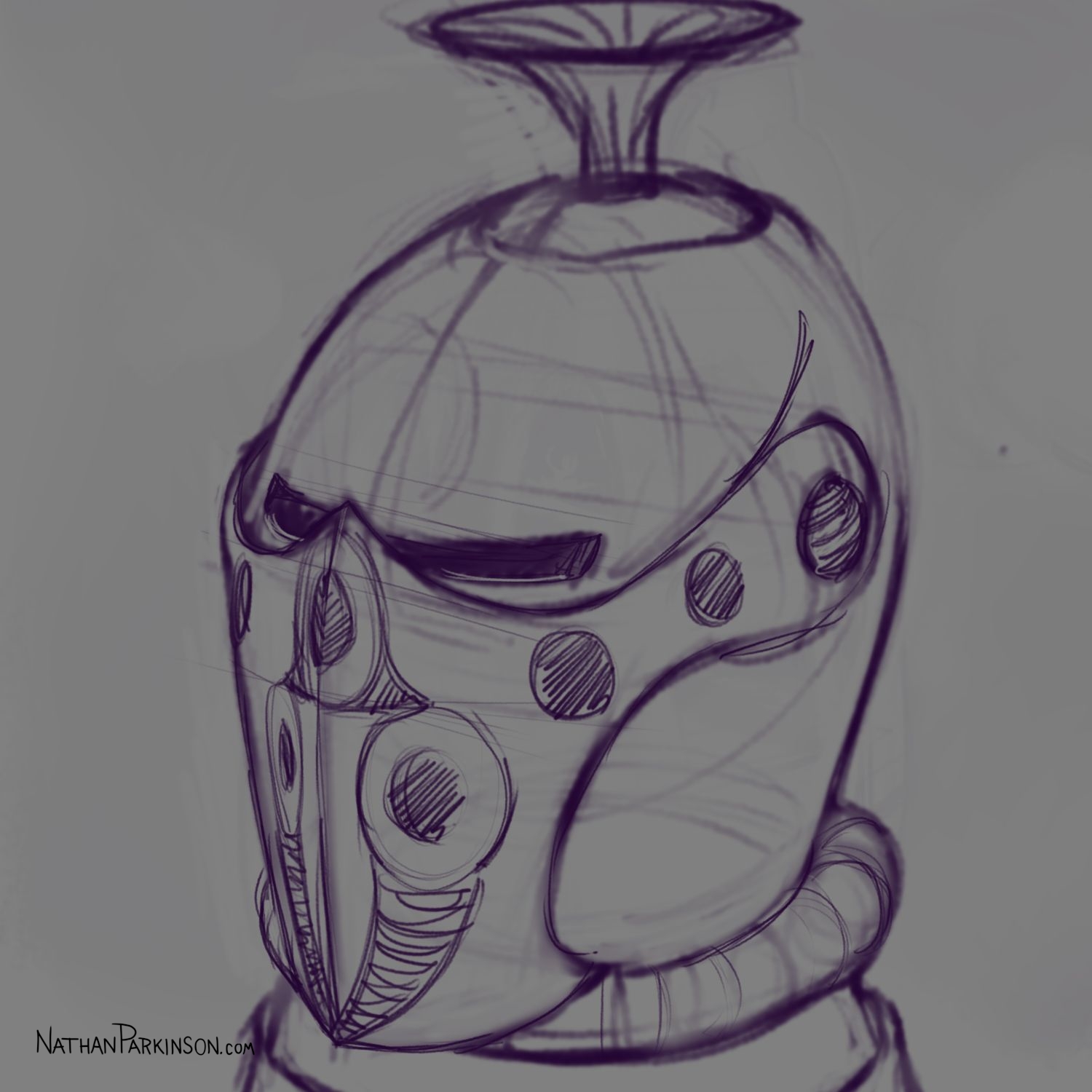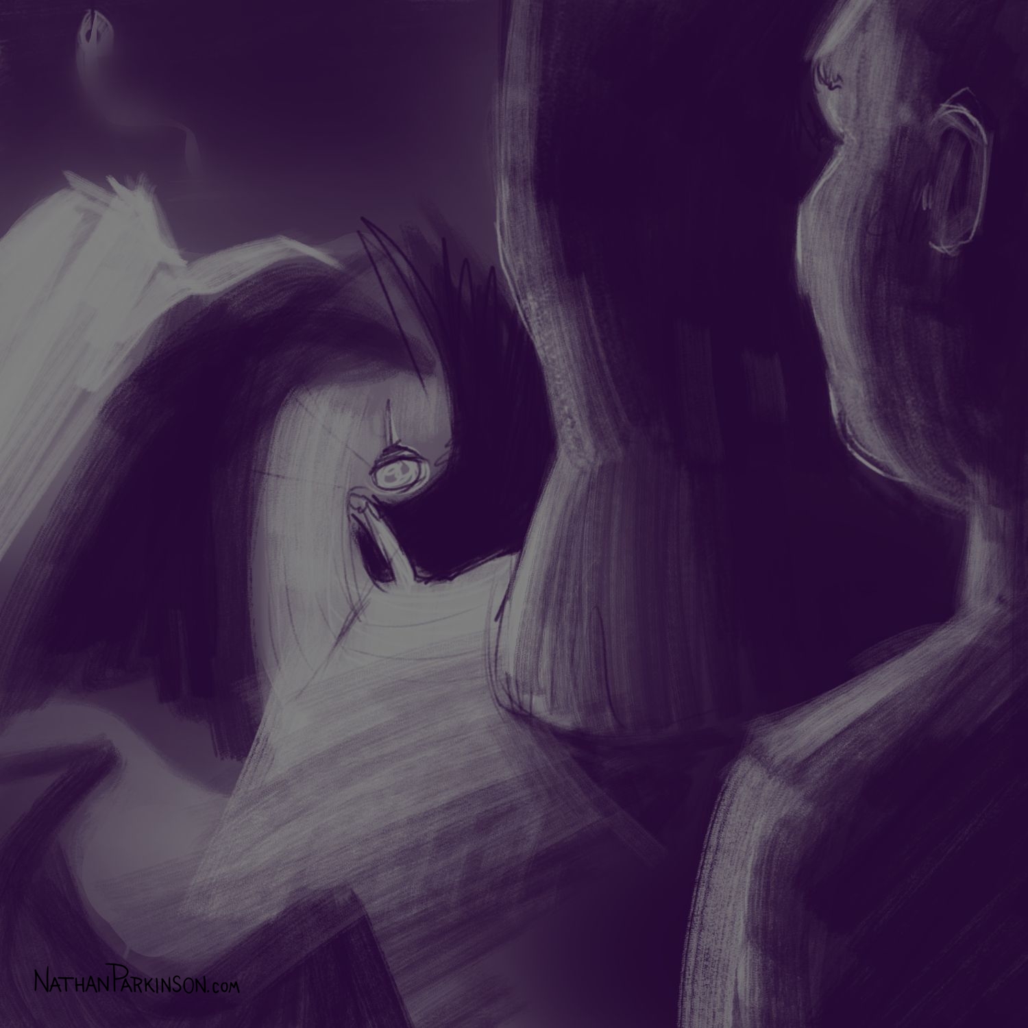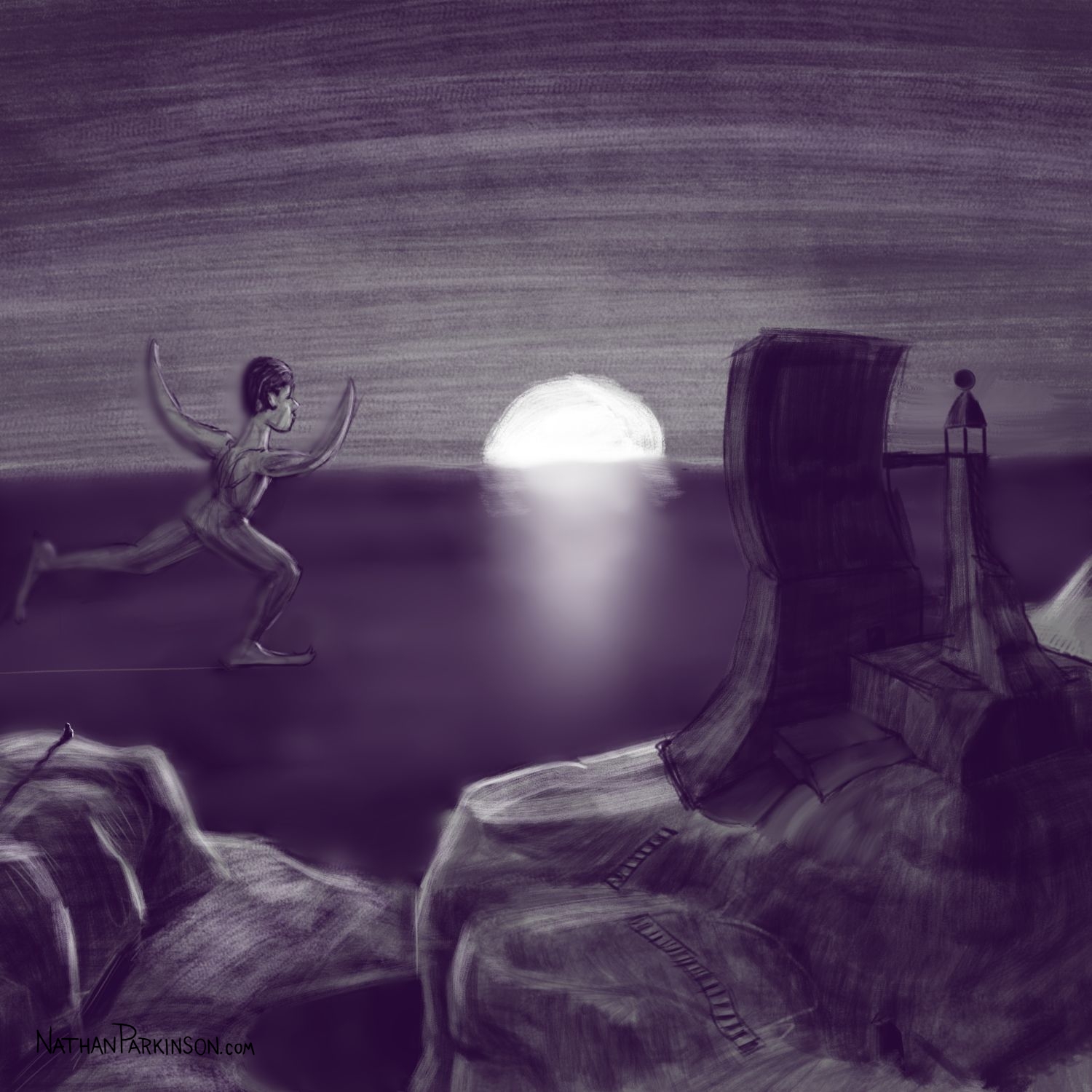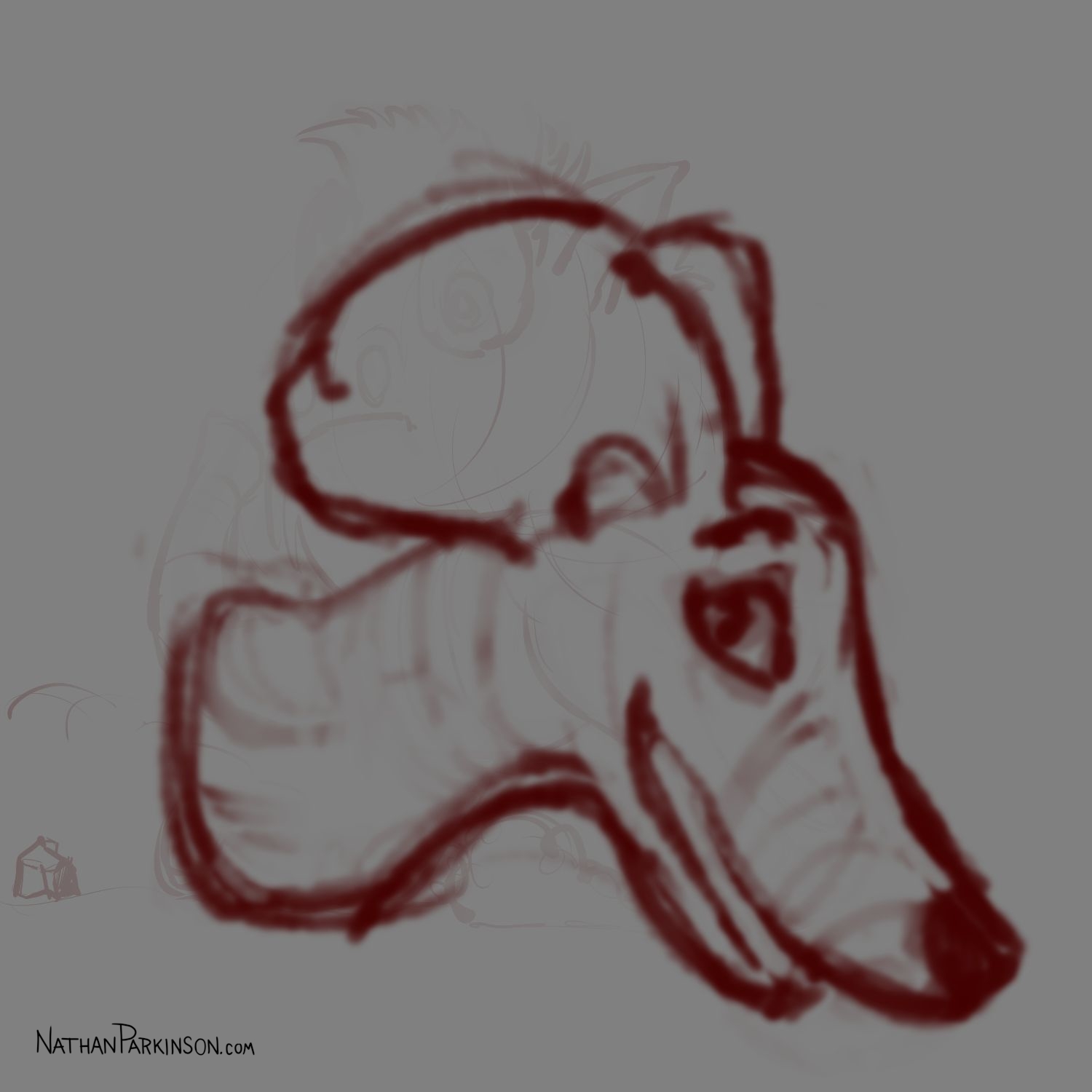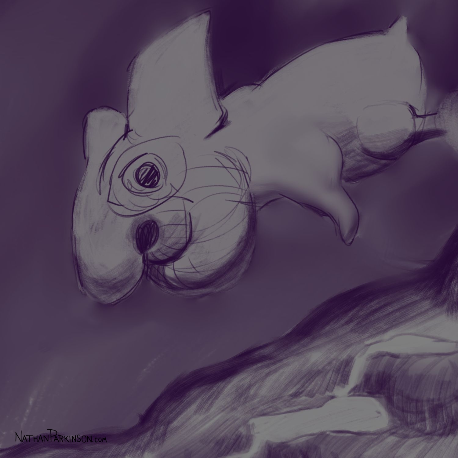 I created a square canvas with a single active layer on a gray background. I chose a pencil brush for drawing and a paint brush for painting and a single colour (I settled on dark purple). At the start of each day I spent about 30 minutes drawing on this single canvas from memory and imagination. I would take whatever was there from the day before and I would morph it into something else. I eventually began to use some white for highlights and light sources, but I only ever drew on one layer. I drew to get darker and erased to get lighter against that gray background. I came to really enjoy this process and I encourage you to try it. I got some really fun results. I think this is a great way to get back your love for drawing just for the fun of it (if you’ve lost it).