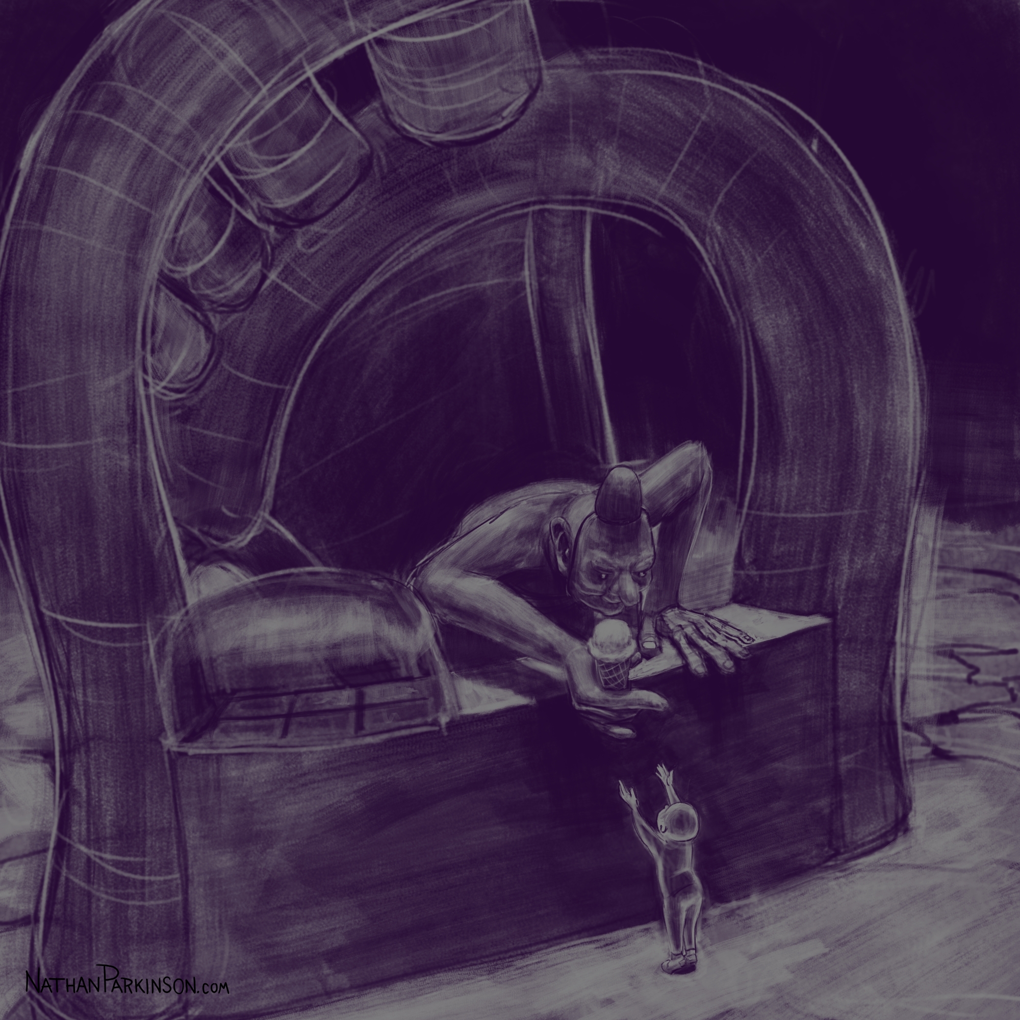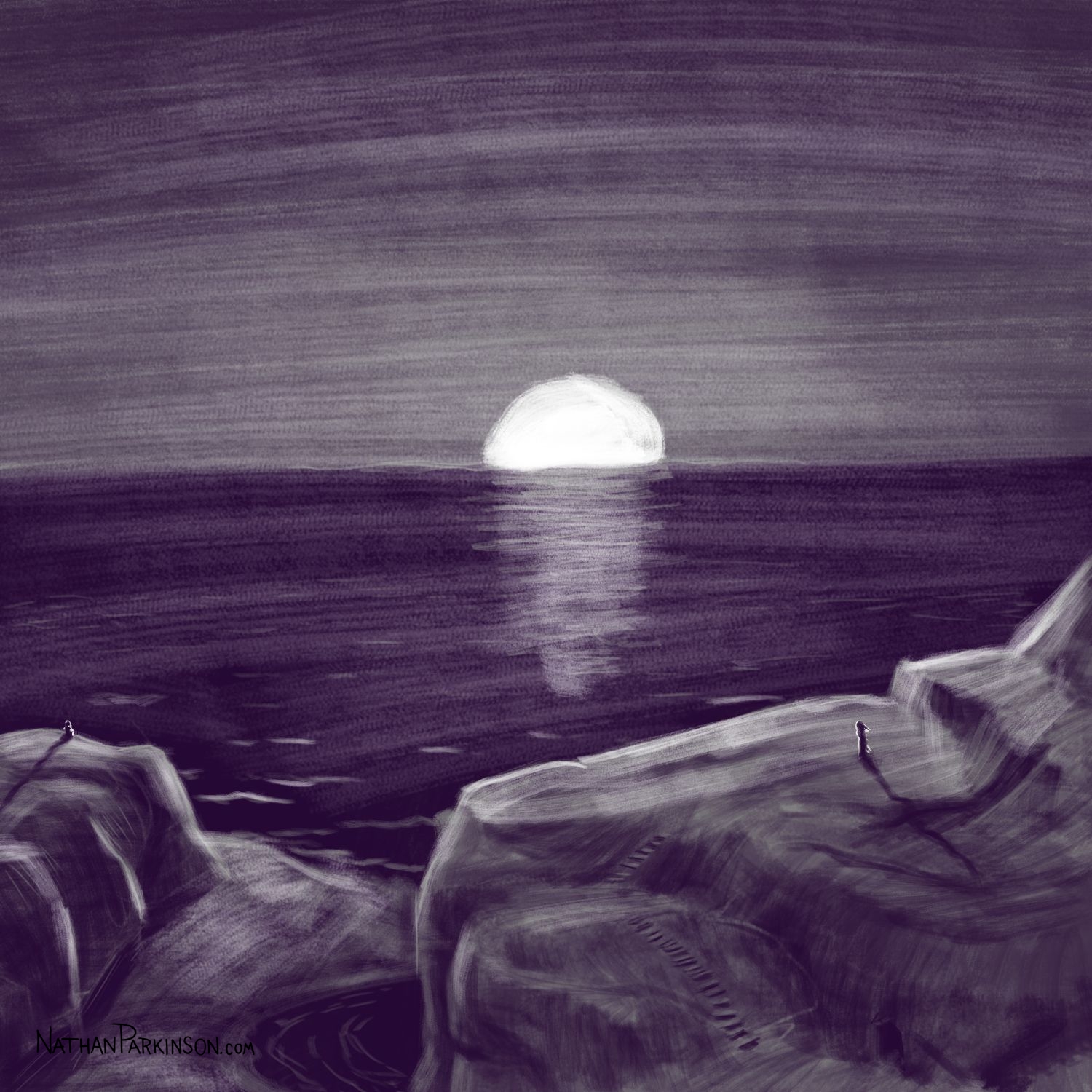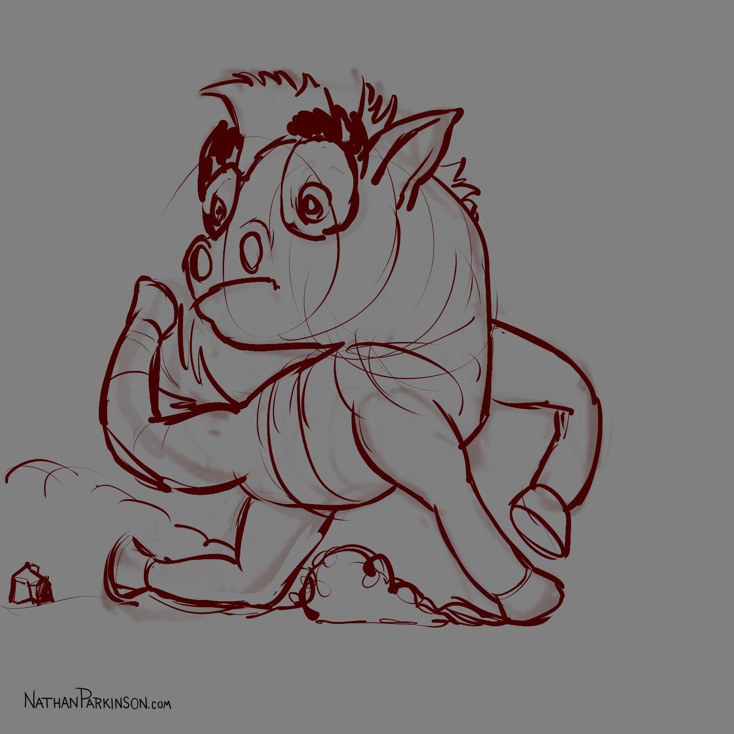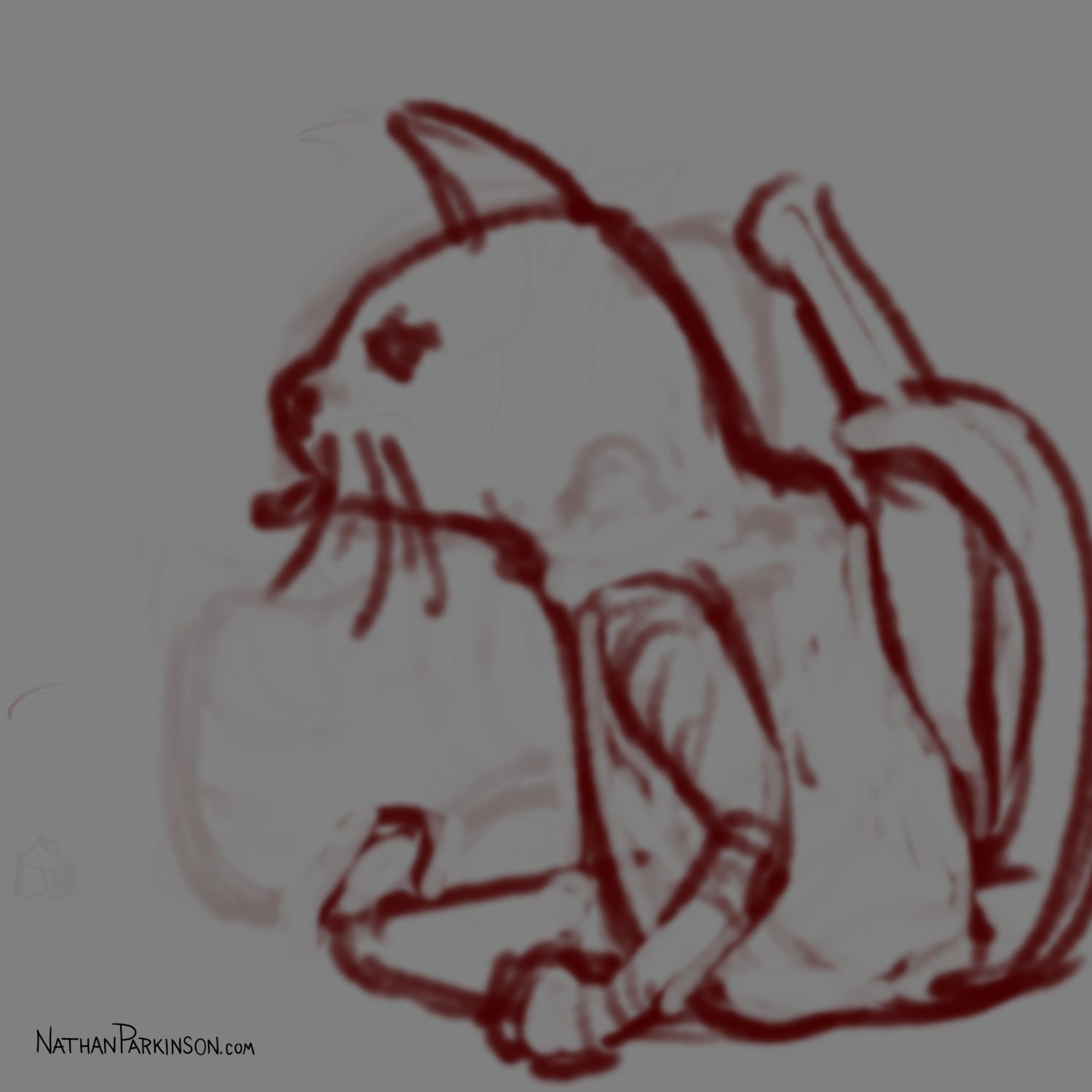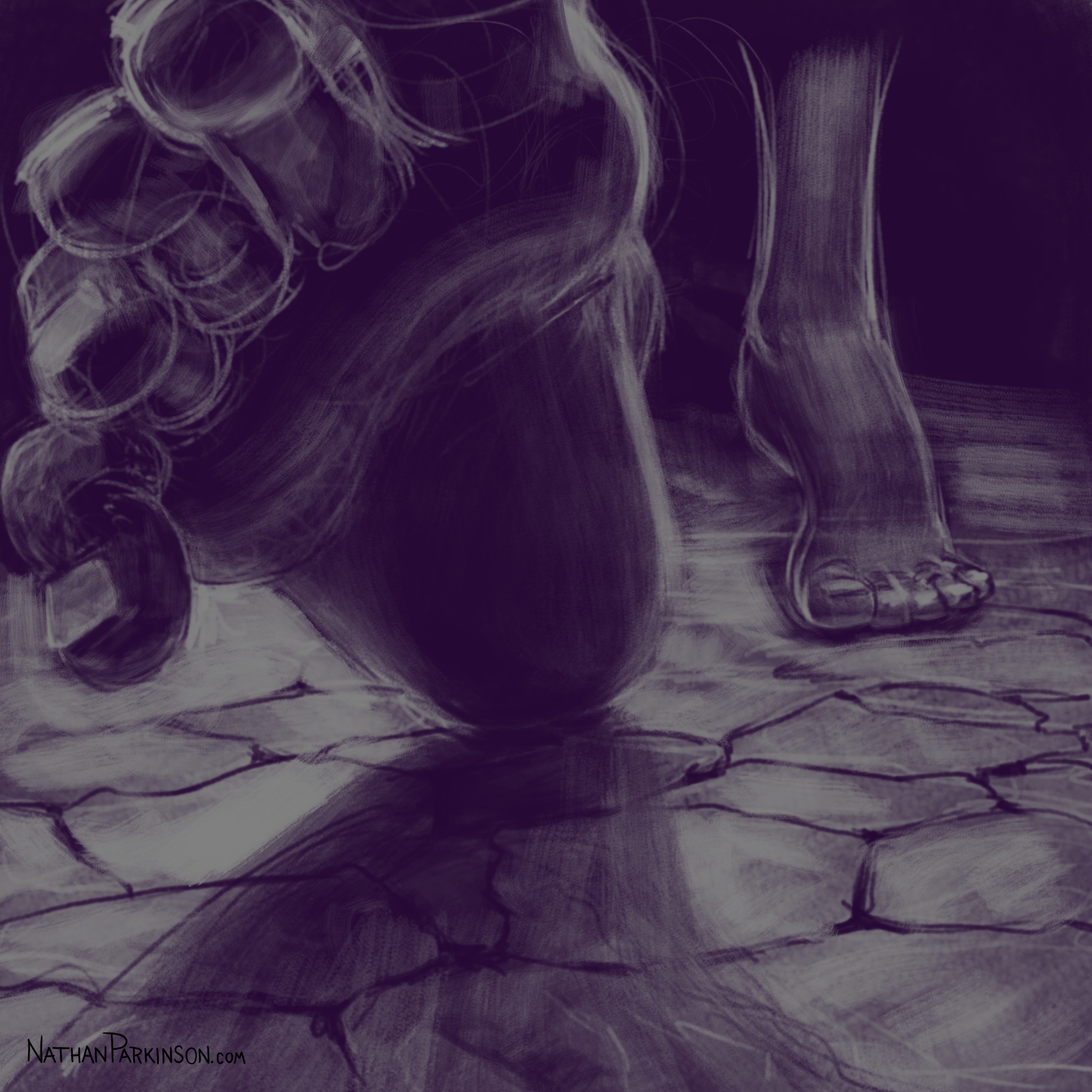 I created a square canvas with a single active layer on a gray background. I chose a pencil brush for drawing and a paint brush for painting and a single colour (I settled on dark purple). At the start of each day I spent about 30 minutes drawing on this single canvas from memory and imagination. I would take whatever was there from the day before and I would morph it into something else. I eventually began to use some white for highlights and light sources, but I only ever drew on one layer. I drew to get darker and erased to get lighter against that gray background. I came to really enjoy this process and I encourage you to try it. I got some really fun results. I think this is a great way to get back your love for drawing just for the fun of it (if you’ve lost it).
